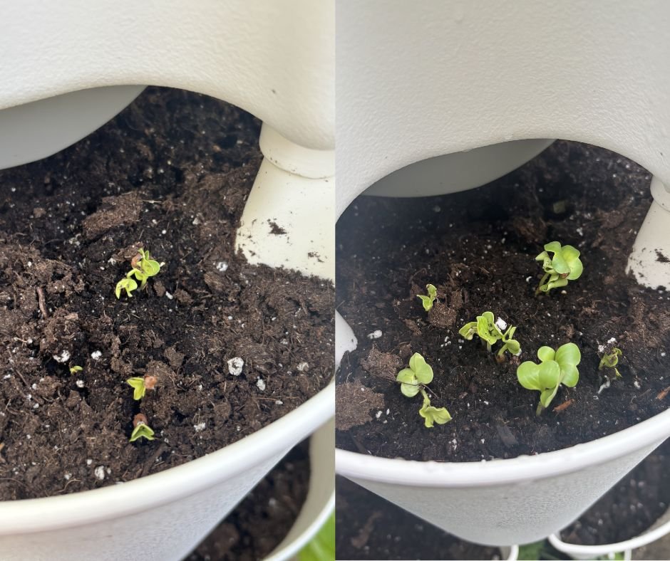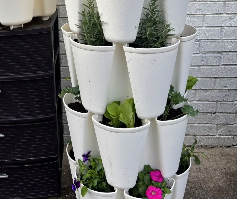 Now, we have our patio decorated, the living room stocked with books and warm lights, the bedrooms mostly settled, and I have my Greenstalk planter set up as my tiny fortress of farm life and homesteading at our apartment.